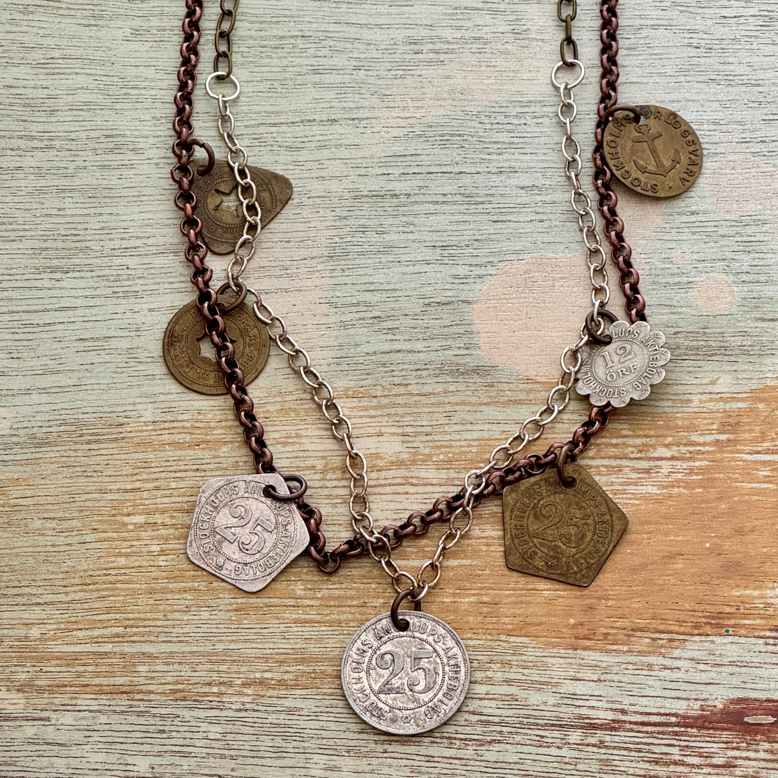 Wearable history.  Swedish Steamship tokens struck between 1885 and 1940.  These tokens now adorn this 25" double strand design on patina brass chains.