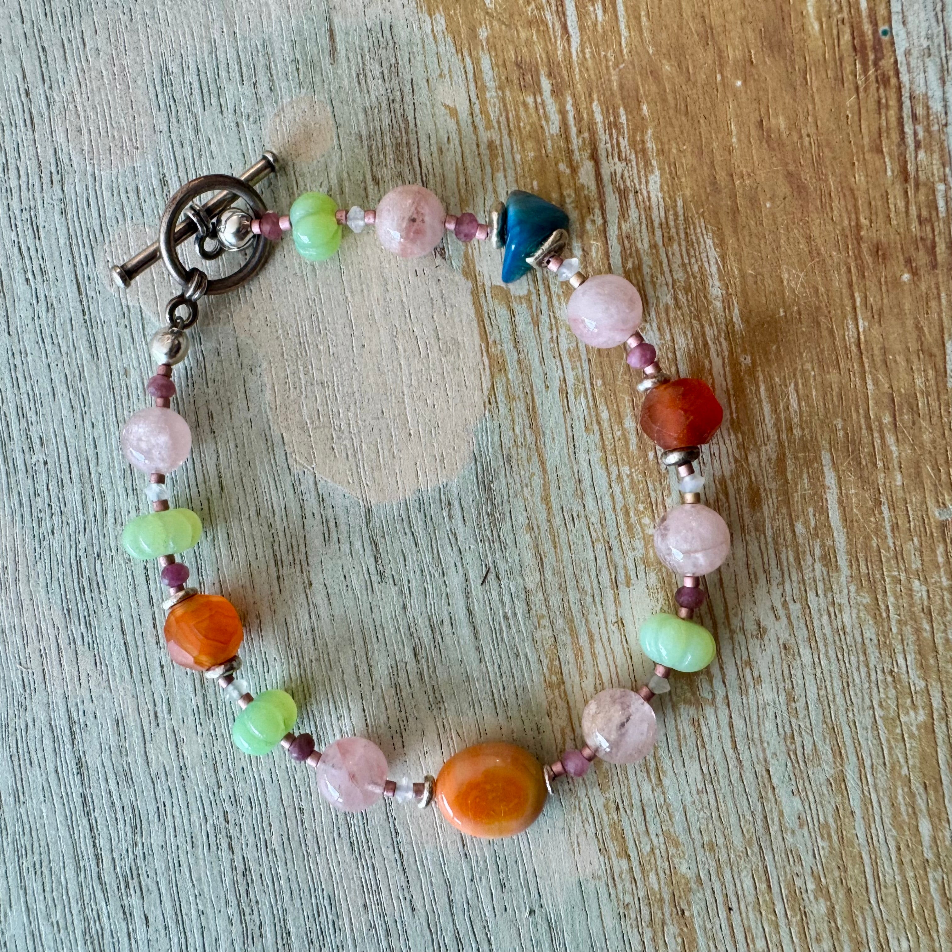 A Swedish blue glass (slag) from the forest of Sweden, tumbled and drilled, combined with carnelian, green agate, rose quartz, and vintage glass. Sterling silver toggle 8 1/2"