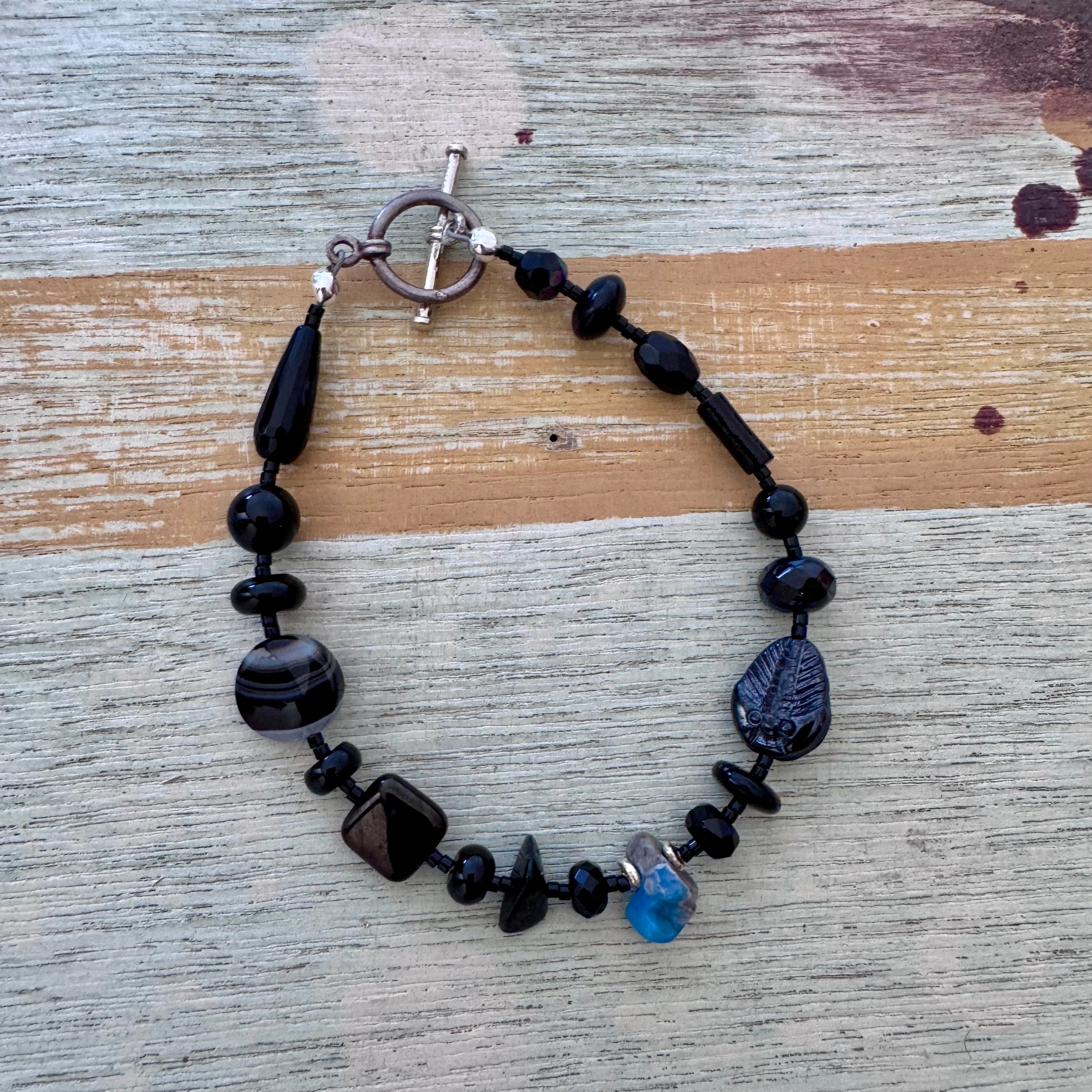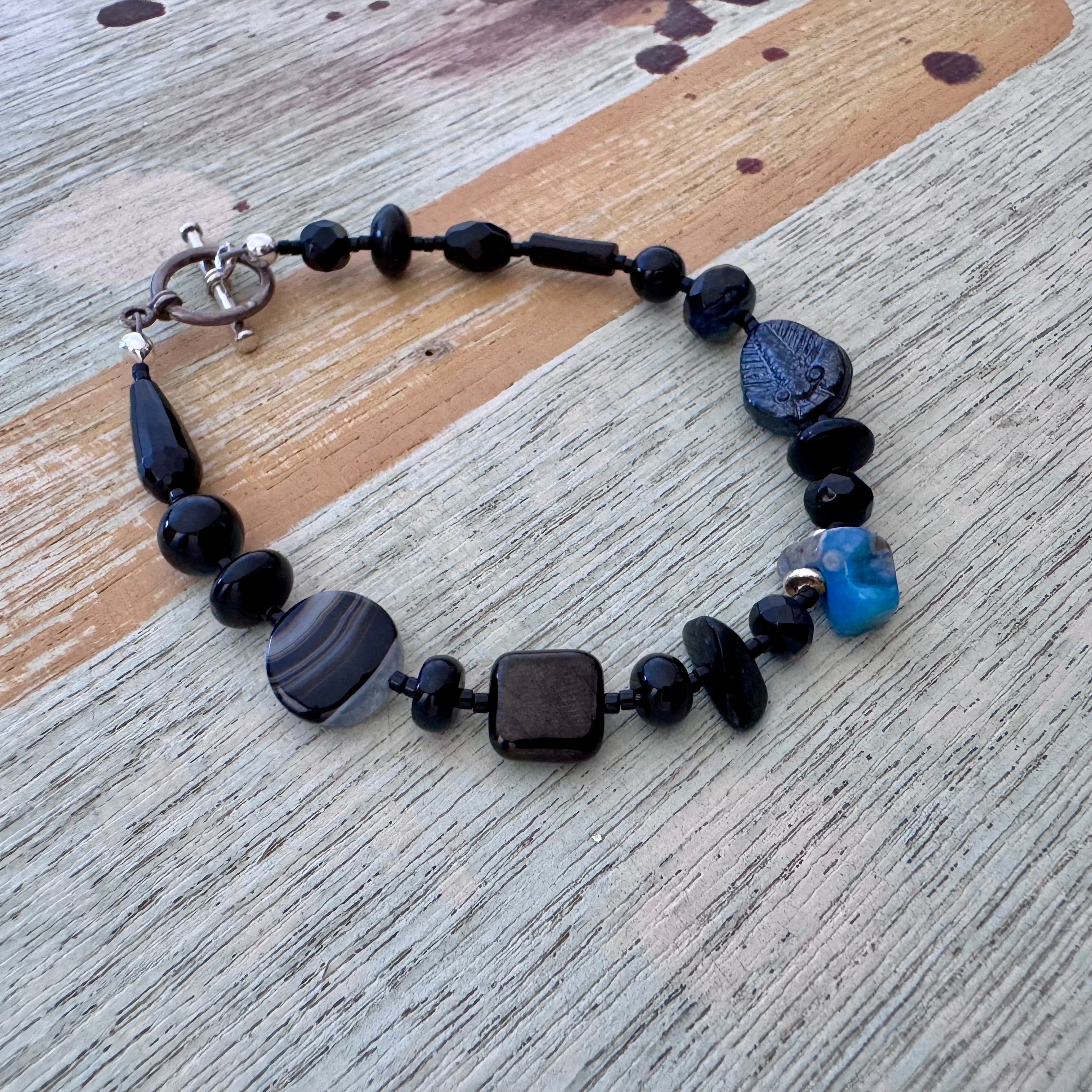 A Swedish blue glass (slag) from the forest of Sweden, tumbled and drilled, combined with various cuts of onyx, agate, jet, wood & Czech pressed glass. Sterling silver toggle clasp, 8 1/2"