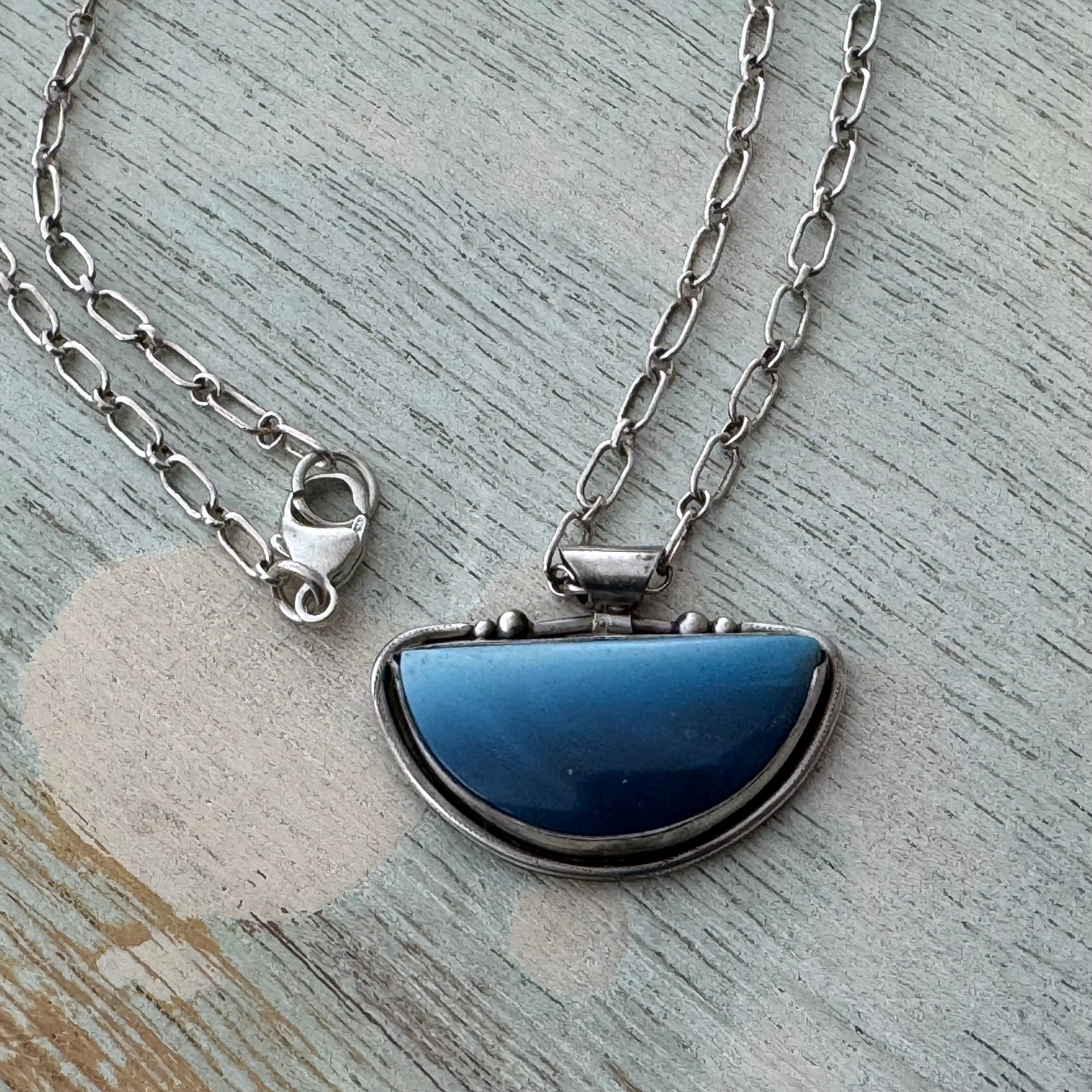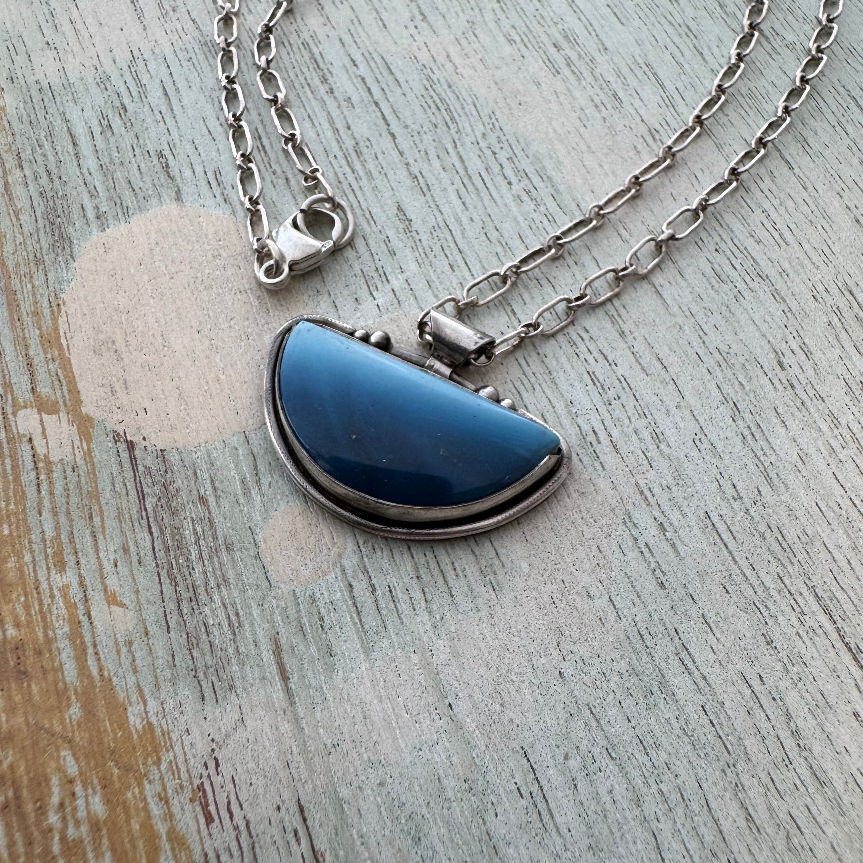 Swedish blue glassy slag cabochon set in sterling silver. Swedish blue comes from the forest of Sweden, left from an industrial era iron smelting process. Now pressure set in this sterling silver design and suspended from approximately 21" of sterling silver chain. Pendant is approx 1" tall 1 1/4" wide