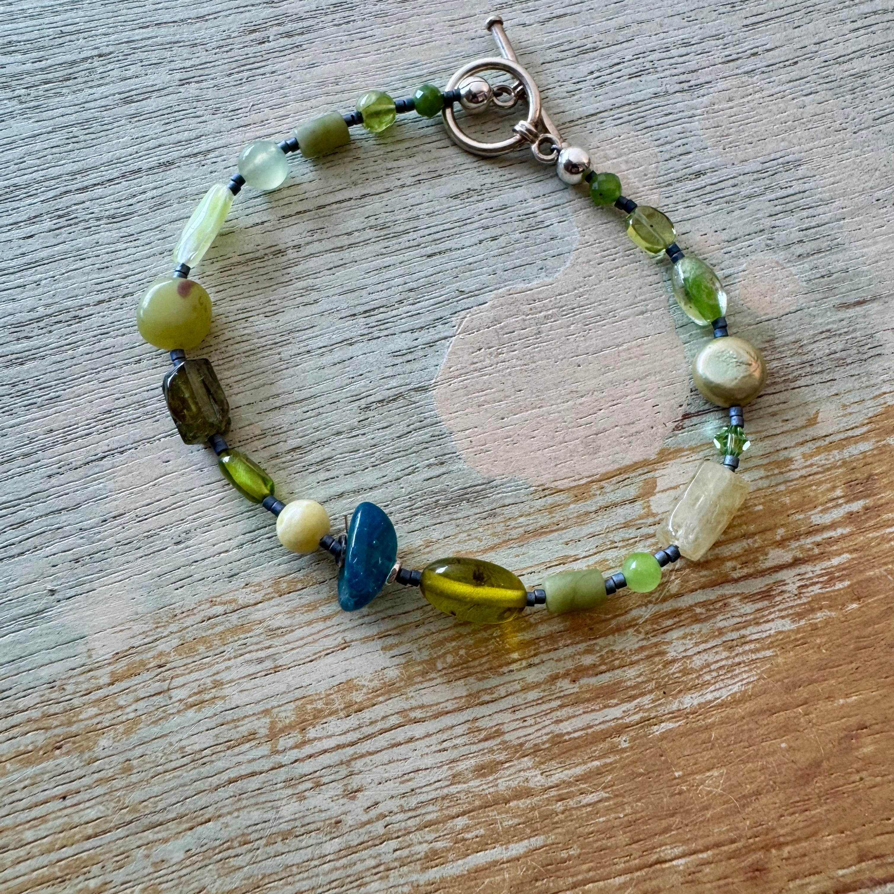 A Swedish blue glass (slag) from the forest of Sweden, tumbled and drilled, combined with various cus of Baltic Amer, peridot, agate, tourmaline, freshwater pearls and a sterling silver toggle. 8 3/4"